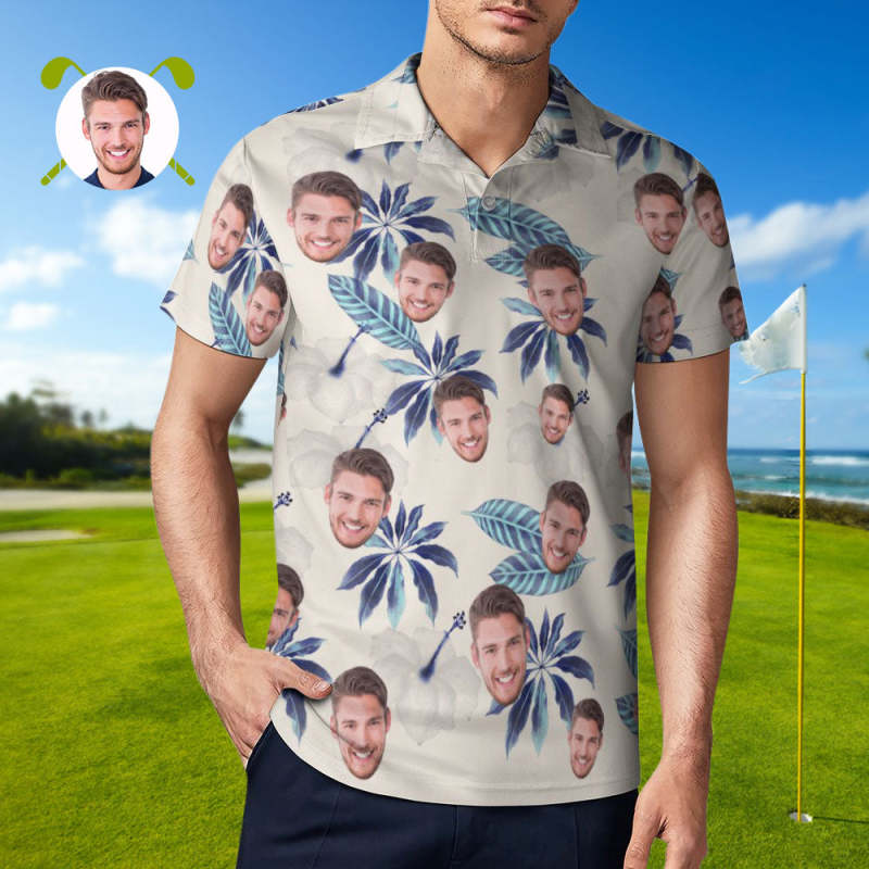 Custom Face Polo Shirt For Men Flowers and Leaves Personalized Hawaiian Golf Shirts