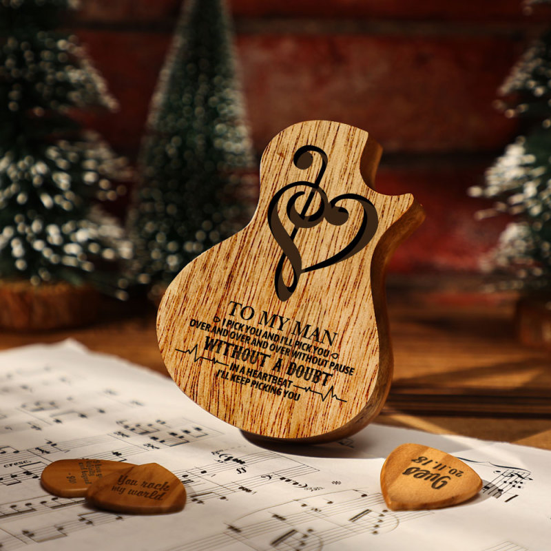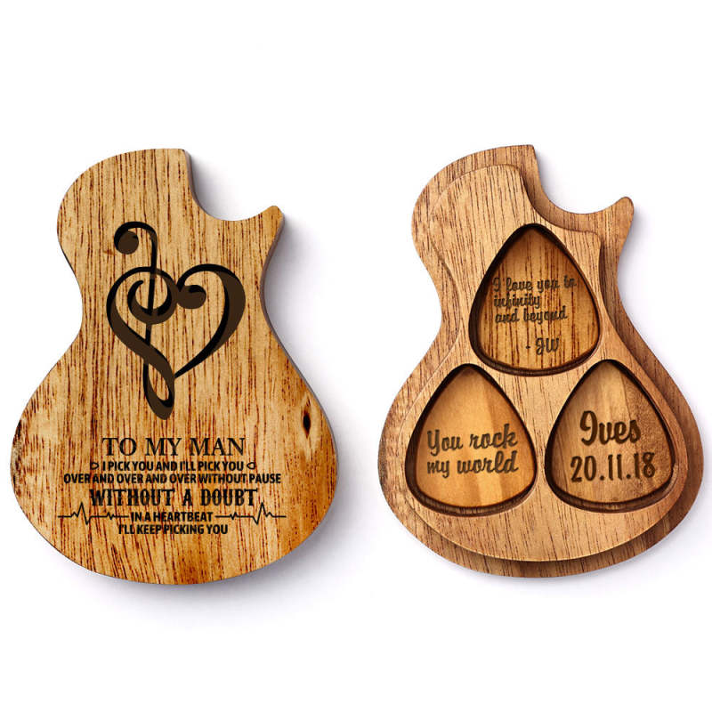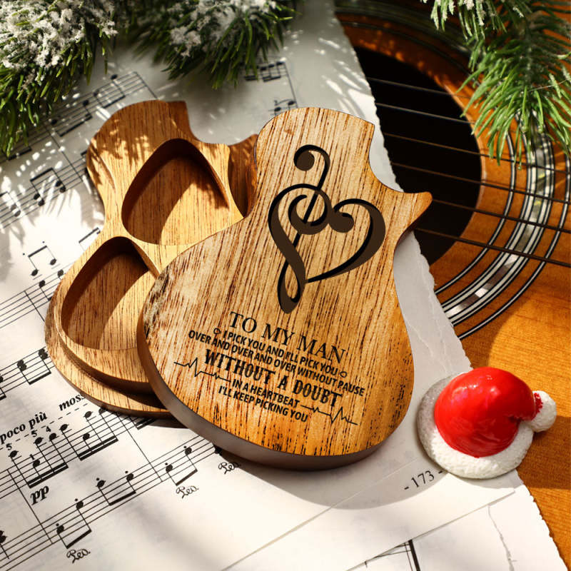 Guitar Wood Picks Box,Guitar Shaped Guitar Pick Box Plectrum Container with 3 Pcs Guitar Pick for Guitar Standard Picks