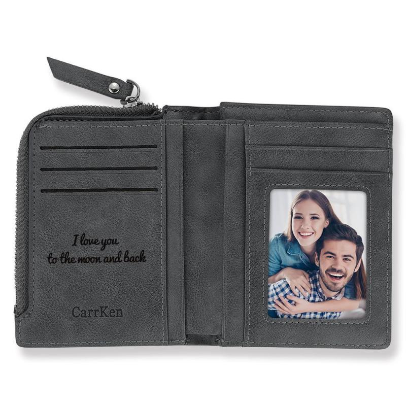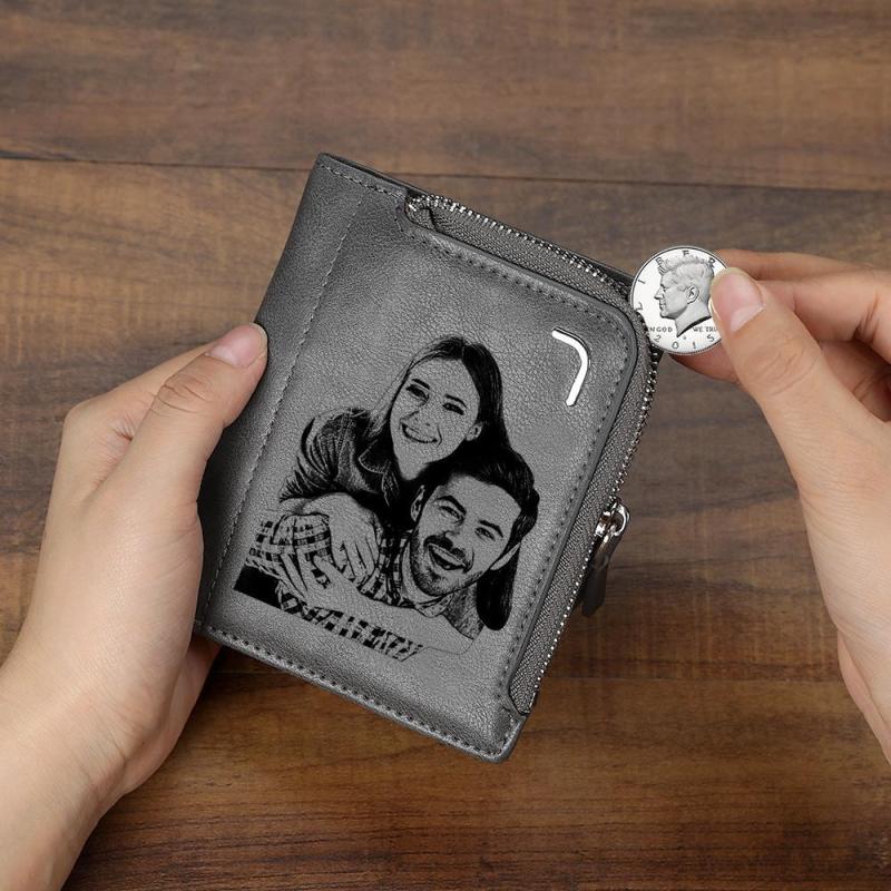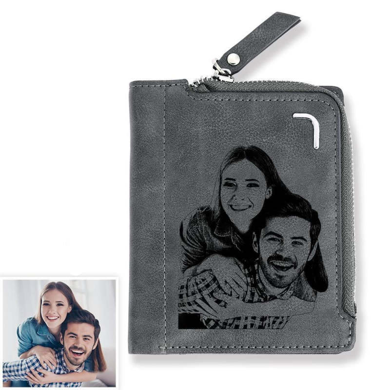 Men's Custom Photo Engraved Bifold Zipper Wallet - Grey