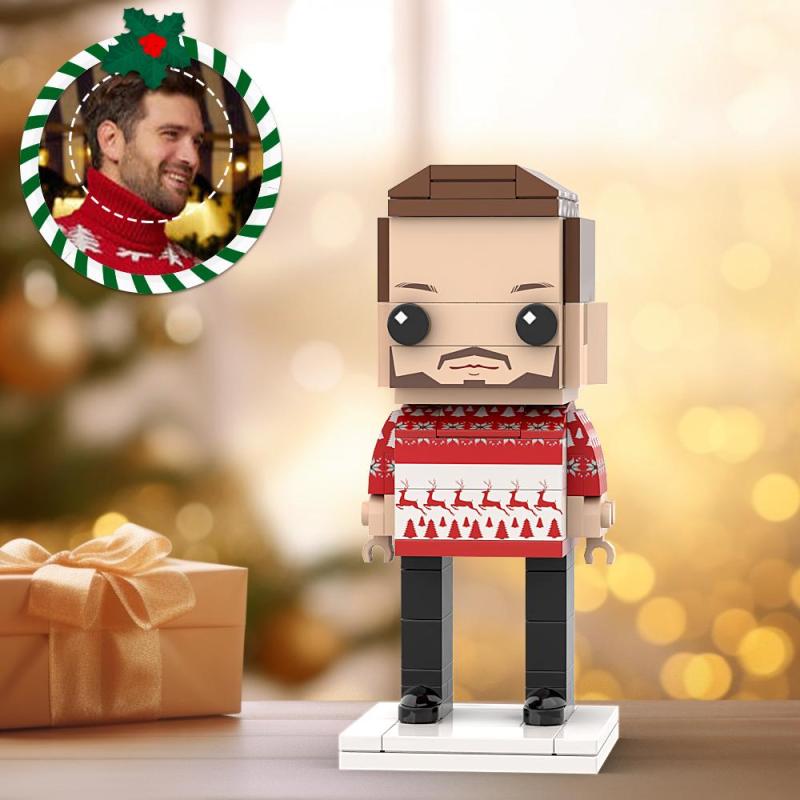 Ugly Christmas Sweater Red and White Custom Head Brick Figures Personalized Christmas Man Brick Figures Small Particle Block Man